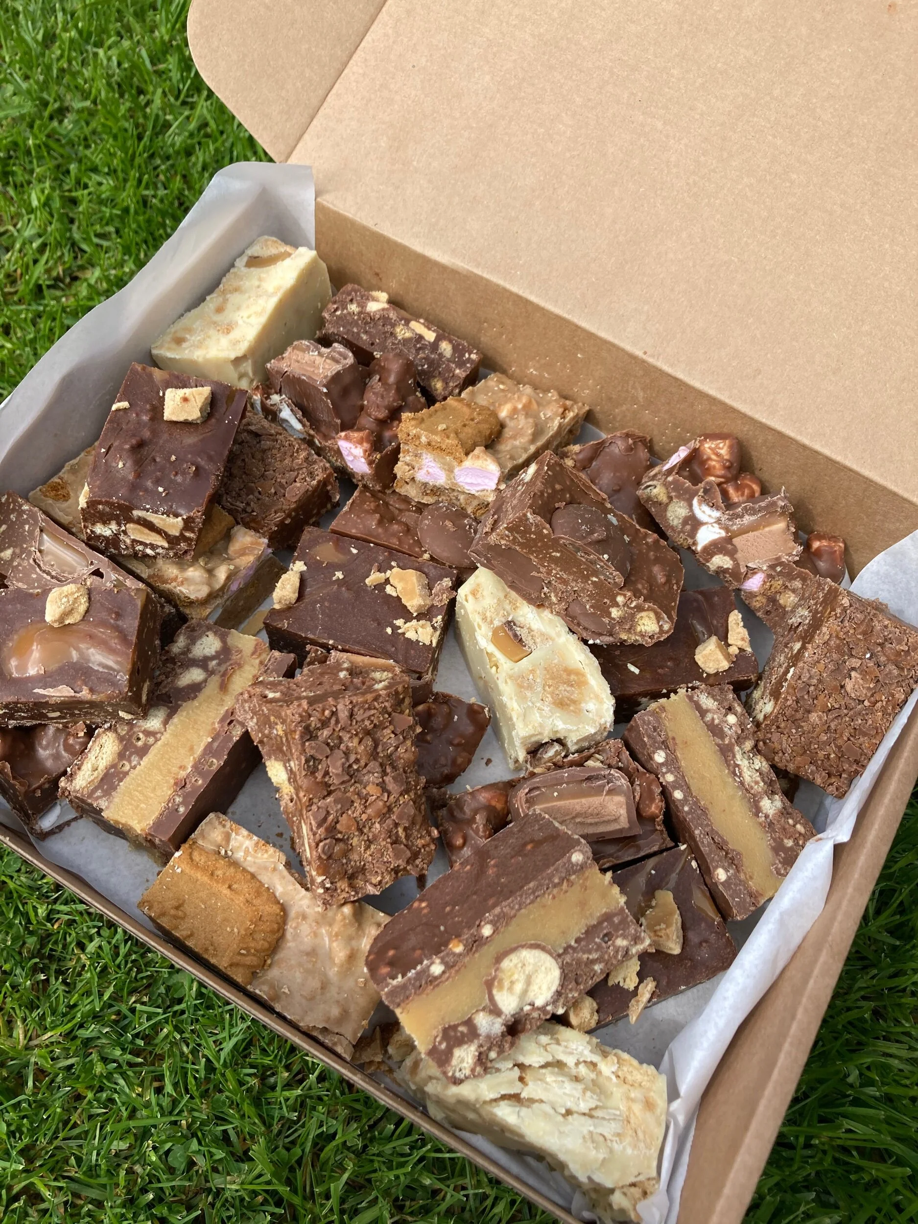 A box full of bites size pieces of rocky road;